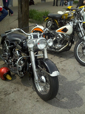 The term pan shovel makes no sense to me. It is either a panhead,shovelhead,early slab side generator shovel,pan bottom with shovelheads or a cone shovelhead. But what does mak sense is Kevin's pan and Bobbie's shovelhead. Two of the best bikes at the Indy ton up show and they did not even have their handlebars turned upside down.
